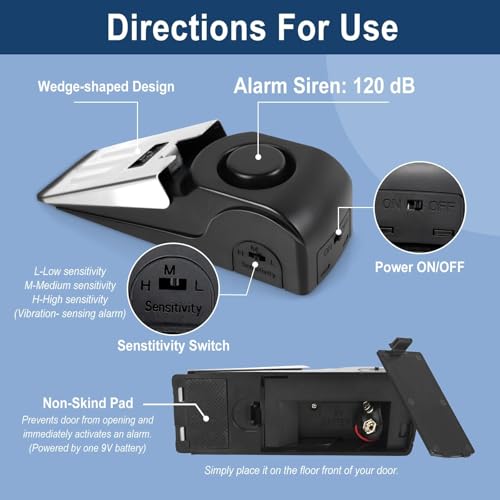 High Volume Alarm – When any individual opens the door to invade the room, the door stops alarm will sound a 120dB alarm and scare off the intruder, whilst reminding the owner of the room to concentrate on safety, when the security threat is lifted you’ll be able to manually turn off the door stoppers alarms and you’ll be able to set the defense again. Note: If the door stop alarm sound cannot be turned off, please adjust the sensitivity to M or L, and then turn it on again