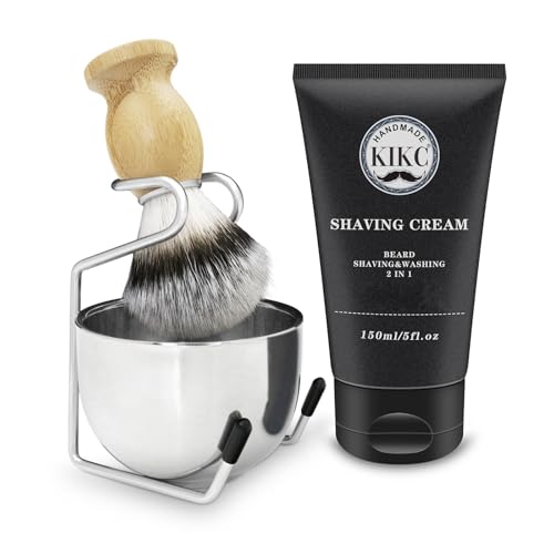 【Shaving Kit All in 1】 This kit includes all you want for wet shaving. One handmade shaving brush with synthetic hair bristle; one stainless-steel soap cup for creating lather; one shave cream(5 fl oz); one prime quality stainless steel shaver brush stand; a handbook for first shave