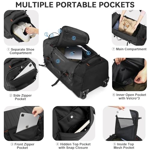 85L 29“ Foldable Rolling Backpack with Wheels, Soft-Side Travel Duffle Bag with Separate Shoe Compartment, Full Quilted Bottom, Black