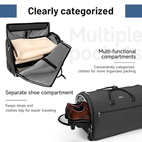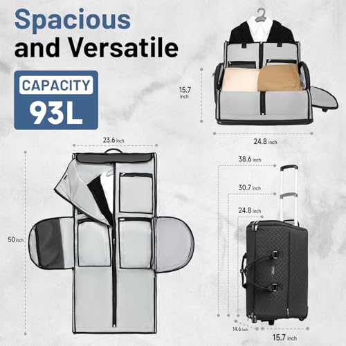 πŸ‘œβœ¨Super Spacious Design–With an impressive 93L capacity, the thoughtfully designed garment compartment offers ample room for suits, dresses, and other wrinkle-free essentials. Stability all the way through transport is ensured, at the same time as the padded clothing area protects your garments. Multiple interior pockets provide easy access to accessories, shoes, and personal items, keeping you organized and ready for any occasion, be it a business meeting or a special event.