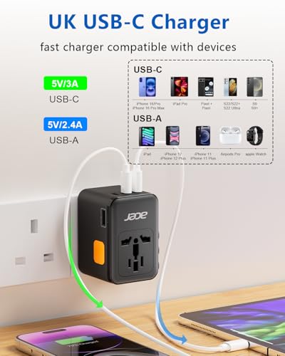 1【6-in-1 Universal Commute Adapter】 This international power adapter has 5 USB ports(45W) and a universal AC outlet which accpet plugs of US, EU, UK, AU, so you’ll concurrently charge 6 of your electronics such as iPhones, laptops, tablets, power banks, cameras, earbuds. This Commute adapter Around the globe ensures seamless connectivity on your Around the globe adventures.