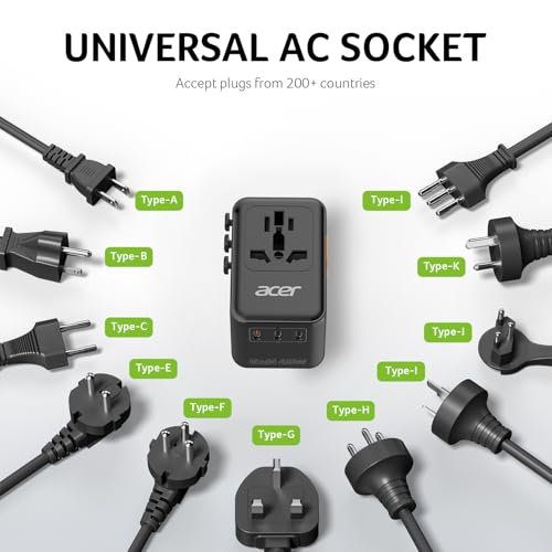 Acer 45W GaN Universal Travel Plug Adapter – International Power Adapter with 3 USB C & 1 USB A, Worldwide Power Outlet Travel Essentials for USA to European UK AUS Ireland, Type C/G/I/A, Black