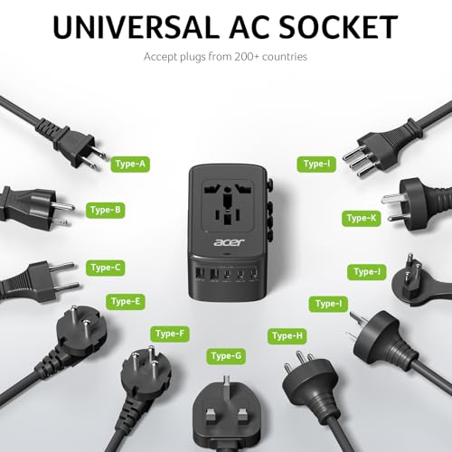 Acer Universal Travel Plug Adapter – International Power Adapter with 5 USB Ports (3 USB C) 5.8A, Worldwide Outlet Charger for USA to European UK France Germany Spain, Type C/E/F/G/I/L/A, Black