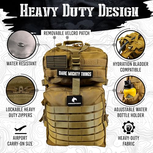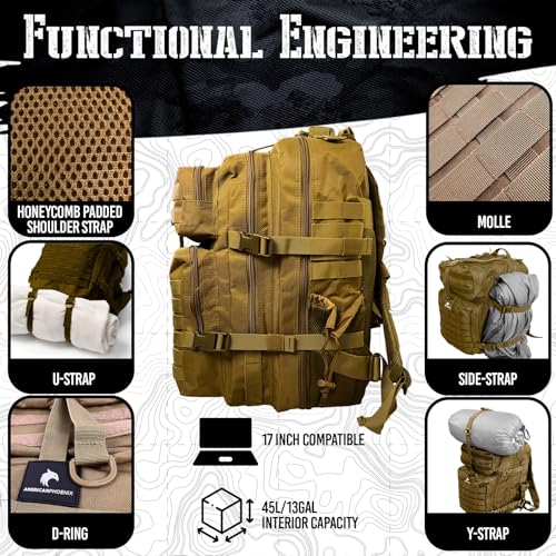 AMERICANPHOENIX 45L Elite Tactical Backpack | 3X Stronger Work & Military Backpack | Water Resistant and Heavy Duty | 3 Day MOLLE Bug Out Bag (Dune Brown)