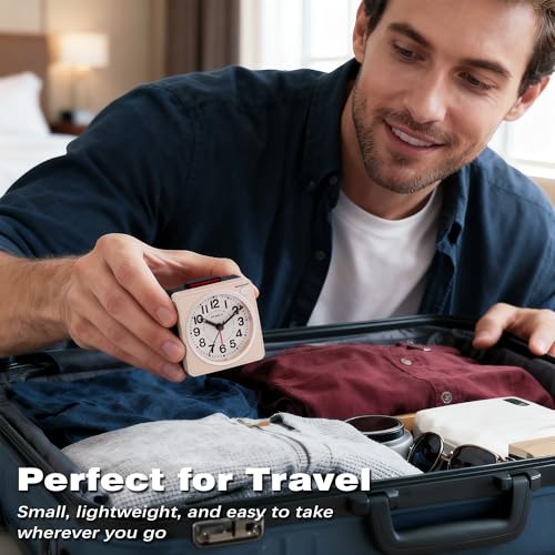 AYRELY® 2.6″ × 1.4″ Ultra Small Battery Operated Analog Travel Alarm Clock, Silent Non-Ticking with Snooze and Light, Retro Bedside Table Clock for Bedroom, Easy Top Alarm Switch (Pink)
