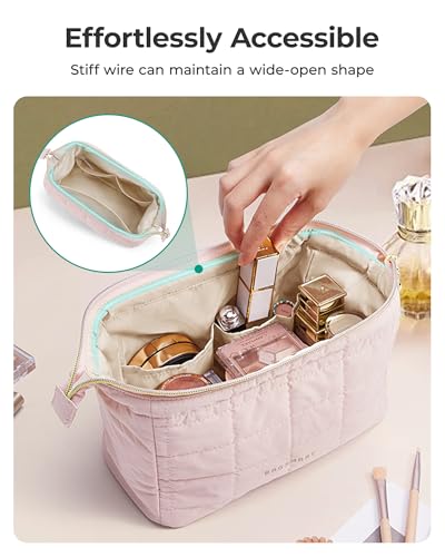 BAGSMART Makeup Bag Travel Toiletry Bag, Puffy Padded Make Up Bags for Women Makeup Organizer Case, Wide-open Pouch Purse Travel Essentials Toiletries Accessories Brushes, Pink