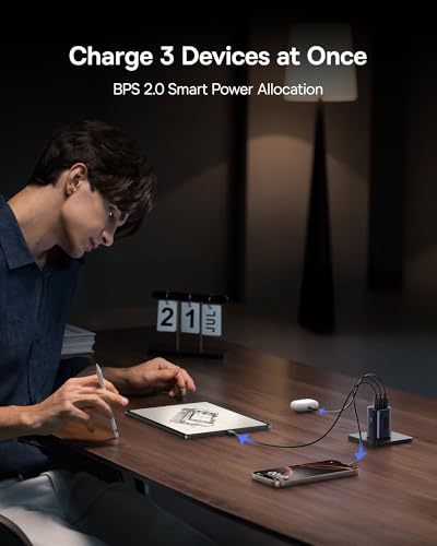 Max. 67W Fast Charging: This usb c fast charger delivers 67W power for a single port and can charge a MacBook Pro 14 at full speed. Fast charge two devices, such as your phone, headphones, or tablet, at the same time, thanks to smart power allocation. The integrated smart chip can intelligently detect and identify the connected device, dynamically adjusting power to prevent overcharging. This fast charger supports multiple fast charging protocols and can charge up to 3 devices at once.