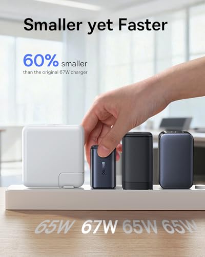 Smaller Size, Greater Portability: Baseus 67W usb c charger adopting high-density integrated design, this fast charger is 60% smaller than traditional 67W chargers, making it easily fit into pockets or carry-on bags. And it may not block or interrupt adjacent sockets. The foldable pin saves space and won’t scratch other items when stored together. It’s an ideal power companion for work trips.