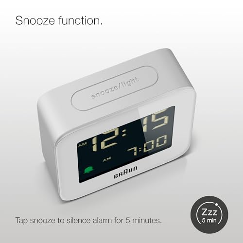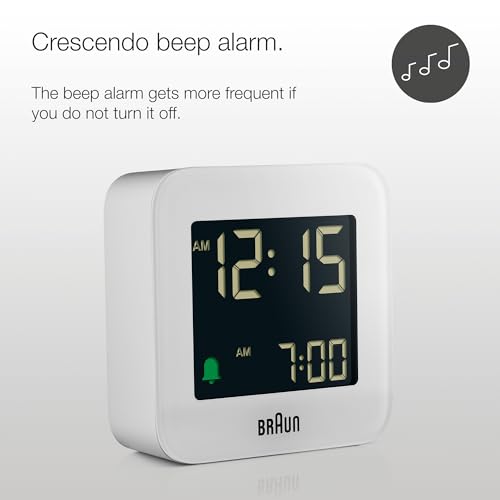 Braun Digital Travel Alarm Clock with Snooze, Compact Size, Negative LCD Display, Quick Set,Crescendo Beep Alarm in White, Model BC08W.