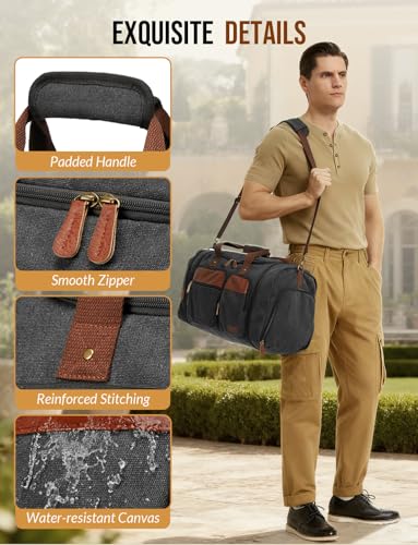 Duffle bag material: This travel duffle bag for men is made of quality water-resistant canvas and PU leather which can protect your items from splashed water, classical bronze-tone hardware, with soft lining, smooth SBS zippers. The grip and detachable shoulder straps are all padded to reduce the burden on the hands or shoulders. 3 carrying ways: hand-held, shoulder, or cross-body