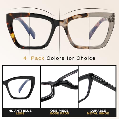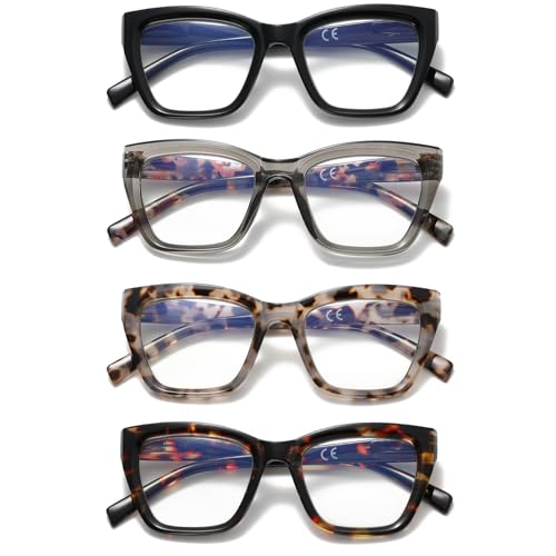 Cat Eye Reading Glasses for Women, 4 Pack Fashion Oversized Blue Light Blocking Computer Readers with Spring Hinge