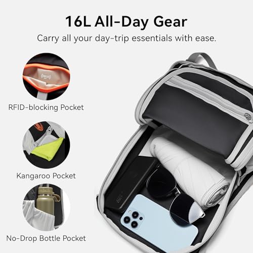 16L for All-Day Adventures: With a 16L capacity, this small hiking backpack efficiently organizes your essentials—main compartment, RFID-blocking pocket, side bottle pockets, kangaroo pocket and front stash pocket. Carry jackets, water bottles, power banks, and snacks with ease.