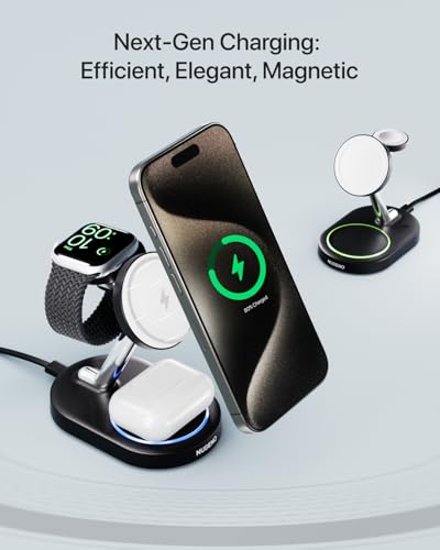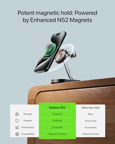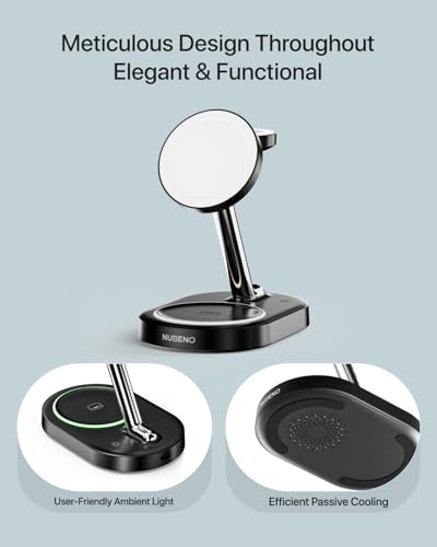 ใ€Tranquil Charging Innovationใ€‘The 3-in-1 charger stand for MagSafe, featuring Nanostabilize technology, operates silently in our charging hub, ensuring peaceful charging even in the quietest environments.