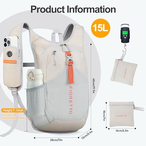 Compact & Hiking Backpack: FIORETTO packable mini backpack measures 17.7″ H x 11″ L x 5.1″ W (45x28x13cm) and weighs just 10.95oz, offering a 15L capacity ideal for minimalist adventurers, day trips, and hiking, or day-to-day commuters. Slip it into luggage as a lightweight backpack or wear it solo for hands-free shuttle. At all times verify that the dimensions match your needs before purchasing.