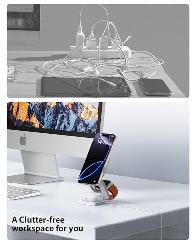 【Strong Magnetic Wireless Charging】The wireless charging station features built-in high-quality magnets that securely hold your iPhone in the optimal charging position and automatically lock it in place. With 3-coil wide charging area, it delivers fast and stable wireless charging experience. Put your iPhone onto the device horizontally or vertically to get it charged instantly. Compatible with iPhone 17/16/15/14/13/12 series (Please work without cases, or use magnetic cases)