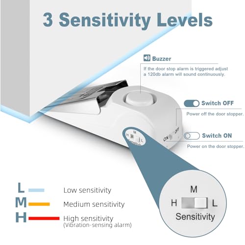 【3 Level of Sensitivities】 High-Medium-Low Sensitivities, which can be adjusted according to your own needs.Loud Alarm: Very loud shrill that would definitely scare someone away with 120db alarm.The door stop alarm powered by 9V battery, One piece can be used for a year under normal circumstances. (Note: Battery not include)