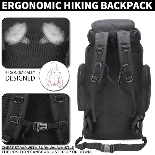 【Mountaineering Backpack Structure】: The 70L camping backpack main compartment is drawstring closed, Mountaineering backpack roomy enough for you storage Mountaineering gear, shoes and luggage, 1 laptop compartment, 1 front zipper pocket and 2 side pocket for separate and orderly storage.