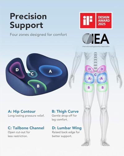 Four-Zone Ergonomic Improve: The chair cushion is expertly crafted to provide four specific Improve zones—hip contour, thigh curve, open tailbone channel, and lumbar Improve wings—shaped to mirror the natural form of your body. This pressure-relieving design helps reduce fatigue, discomfort, and stiffness. Perfect for those in search of seat cushions for office chairs or a pressure relief seat cushion for day-to-day use.