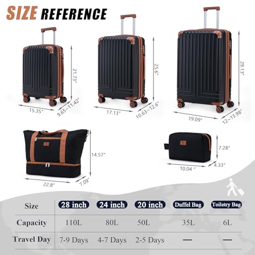 KUNEL Expandable 5 Piece Luggage Sets with Detachable Spinner Wheels and TSA Lock, Unisex Hardside ABS Suitcase Set, Hardshell Lightweight Waterproof Travel Hard Case Suitcases with Wheels, Black