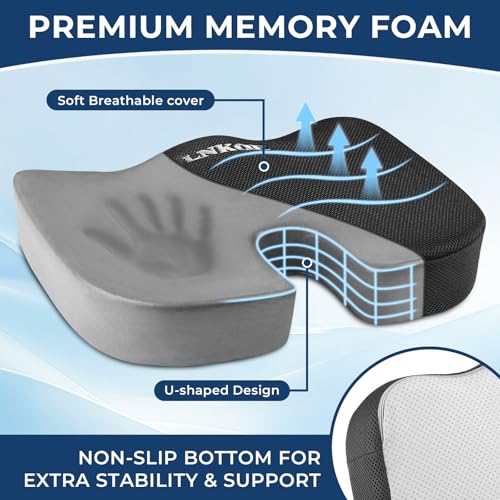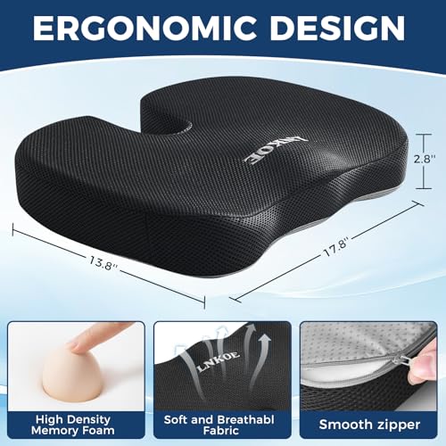 LNKOE Seat Cushion Memory Foam Cushion for Office Chair, Car Seat, Airplane, Bleacher – Sciatica & Hip & Coccyx Pain Relief Desk Chair Cushion for Long Sitting Office Workers, Car Drivers