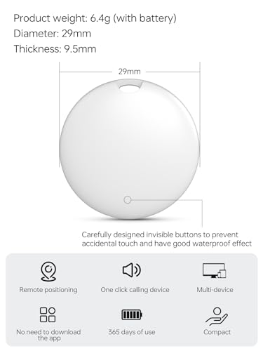 [Smallest and Thinnest on the Net] Portable anti-lost tracker measures 1.1 x 0.4 inches (29 x 9.5 mm), and weighs only 0.2 oz (6.4 g), making it lightweight and thin, making it very convenient to carry. The holes allow you to easily attach it to your bag, key chain, pet collar, etc.