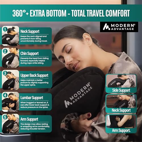 Modern Advantage Inflatable Travel Pillow for Airplanes with Adjustable Extra Bottom, Support Head & Chin to Avoid Neck & Shoulder Pain, for Travelling, Office Napping with Eye Mask & Earplug