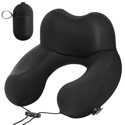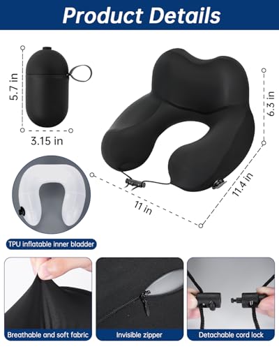 Neck Pillow for Traveling, 2-in-1 Air-Pump & Storage Bag, Inflatable Compact 360°Head Support Airplane Pillow for Travel,Train, Car – Black