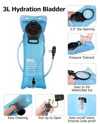 Professional Leakproof 3L TPU Water Bladder – Our hiking water backpack packs with a 3L large capacity TPU hydration bladder, which is no BPA and odor, and has a 3.5” large open mouth, which is easy to clean and add ice cubes. And 3L large capacity ensures enough water supply for a long day’s exhausted hiking, trekking, biking.