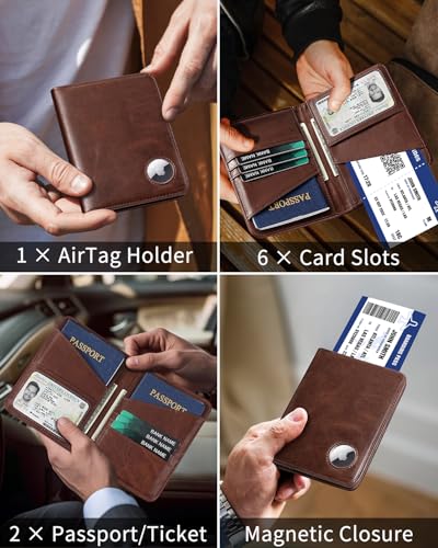 Passport Holder for Travel with AirTag Holder-Genuine Leather RFID Blocking Travel accessories with 6 Cards Slot&1ID Window,Magnetic Closure,Gift Box(Air Tag Not Included)