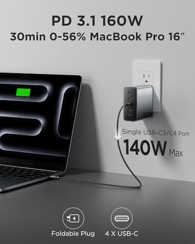 PISEN 160W USB C Charger – PD3.1 GaN Fast Charger USB C 4-Port Foldable Charging Block 160Watt Power Adapter with 6FT 240W Type-C Cable, 160W Charger for MacBook, Laptops, Samsung, iPad, iPhone Series