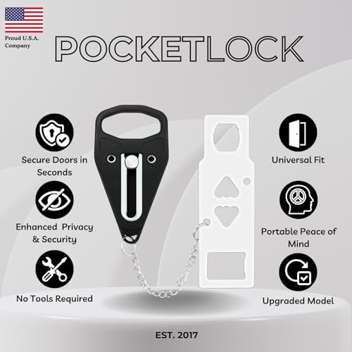 TRUSTED PROTECTION + U.S. SUPPORT – Ideal for women travelers, solo travelers, students, seniors, and renters seeking hotel door security and apartment safety. PocketLock is a proud U.S.A. company with responsive fortify. In the box: 1 portable door lock (with 2 inserts) with carrying case, 1 door stop alarm, quick-start guide.