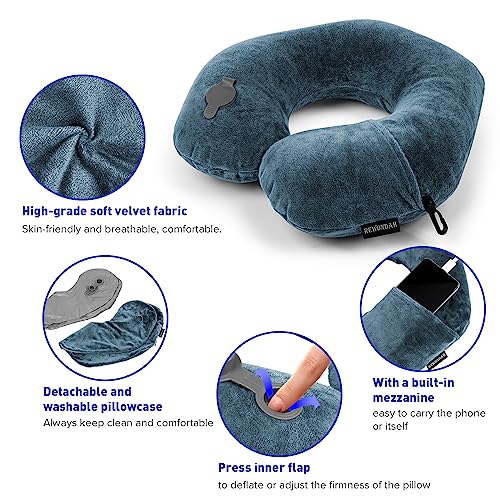 Rewondah Neck Pillows for Travel, Inflatable Travel Pillow, Inflatable Neck Pillow for Traveling Airplane with Soft Velour Washable Cover, U Shape Blow Up Neck Pillow for Airplanes Train Car Travel