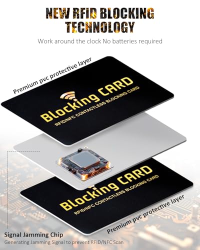 3: THE ULTRA-THIN DESIGN IN SAFE AND RELIABLE : Ultra-thin profile adds minimal bulk to your wallet while providing maximum RFID blocking capabilities. At the size of a standard credit card and at only 0.03” thick, the card will fit into any wallet, purse or card case. Linmxiy RFID blocking card features the latest 13.56 MHz RFID/NFC blocking technology. It generates a jamming signal to disrupt radio frequency signals within a 2.4-inch range (1.2 inches on each side), making it the perfect safeguard card for everyday use.