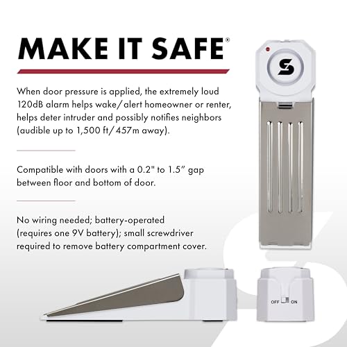 A burglary occurs every 14.5 seconds in the U.S., and budget cuts have led to an average 911 response time of 10 minutes. Furthermore, without the ability to install a home security system, renters and travelers can have a hard time feeling safe in their temporary housing. SABRE’s Door Stop Alarm is a great solution to either help make stronger an existing home alarm system or use on its own in a bedroom, dorm, hotel room or apartment. The extremely 120dB loud alarm is audible up to 1,500-feet (455-meters) away and sounds when door pressure is applied. It is compatible with doors that have a 0.75″ gap between the floor and bottom of door (if the gap is greater, the alarm won’t be able to activate when the door is opened). The alarm is coupled with a non-skid pad to prevent the door from opening. This attractive, premium white alarm installs easily in just seconds – simply slide it under the crack of an inward-swinging door. There’s no wiring needed, so the alarm works all through power outages. Requires 1x9V battery (not included). A small Philips Head #1 size screwdriver is required to remove battery compartment cover. For an extra level of security, the Door Stop Alarm provides a battery status update via a low battery indicator. The Door Stop Alarm used to be developed by SABRE, the #1 pepper spray brand trusted by police and consumers around the globe, meaning this product is extremely reliable. Backed by over 45 years in the security industry, SABRE products will have to pass rigorous quality assurance testing before leaving our facilities to come up with peace of mind. Give a boost to your home security today.