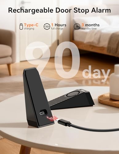 USB-C Rechargeable: The door stopper has a built-in rechargeable lithium battery—no AAA replacements required. Easily charge your door alarm via a standard USB-C charging cable in 2-3 hour and enjoy up to three months of continuous protection. This door wedge is an acceptable choice for on a regular basis home security.
