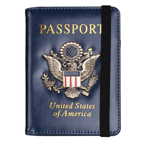 TOURSUIT RFID Blocking Passport Holder for Women Men, Leather Passport Travel Wallet with Metal 3D Metal Badge, Travel Document Holder Cover Accessories (Dark Blue)