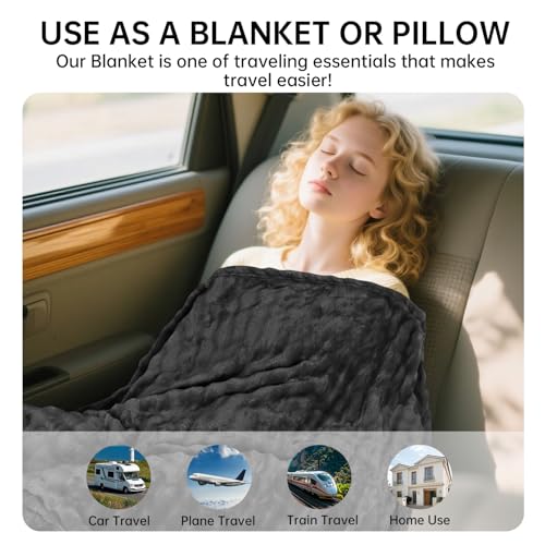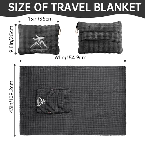 Travel Blanket and Pillow-2-in-1, Ultra-Soft&Compact, One-Piece Airplane Blanket with Hand Luggage Belt and Backpack Clip,Travelers Accessories Gifts, 61×43 Inches (Dark Grey)