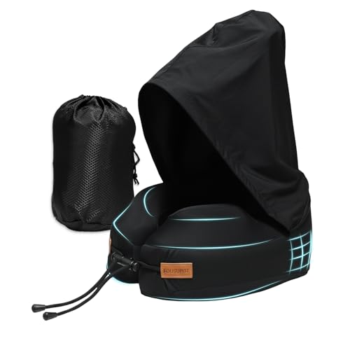 Travel Pillow with Hood, Memory Foam Airplane Neck Pillow for Long Flight, Soft, Comfort Portable Travel Neck Pillow for Flight, Drive, Work, Rest, with Storage Bag