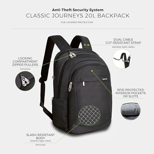 The Travelon Anti-Theft Classic Large Backpack has the entire space, organization and protection you’ll be able to need in a day bag or carry-on. Stay organized with 3 compartments. The front compartment has RFID blocking card and passport slots, an open top and zip pocket, 2 pen loops and a tethered key clip. The rear compartment is fleece lined to hold a laptop to 15.6 inches and has a padded pocket for an iPad or tablet. The roomy main compartment has a wall pocket to hold large items. A top grab deal with and trolley strap make it versatile and easy to carry. Front zippered pocket for quick grab items. Trip securely and optimistically with Travelon’s anti-theft technology, including slash-resistant construction, locking compartments, and slash-resistant straps to keep you and your belongings secure.