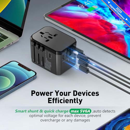 𝟲-𝗜𝗡-𝟭 𝗧𝗥𝗔𝗩𝗘𝗟 𝗔𝗗𝗔𝗣𝗧𝗘𝗥: This universal travel adapter is an efficient solution to charge 6 devices simultaneously with 3 USB-C, 2 USB-A, and an AC outlet. This international power adapter suits all USB devices, laptop, camera, tablet, etc