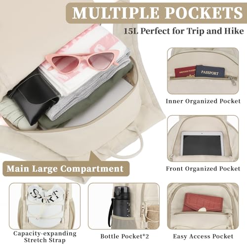 ZOMFELT Hiking Backpack for Women Men, 15L Lightweight Packable Backpack for Trip, Water Resistant Small Travel Backpacks, Foldable daypack for Hiking, Walking, Cycling, Camping, Beige